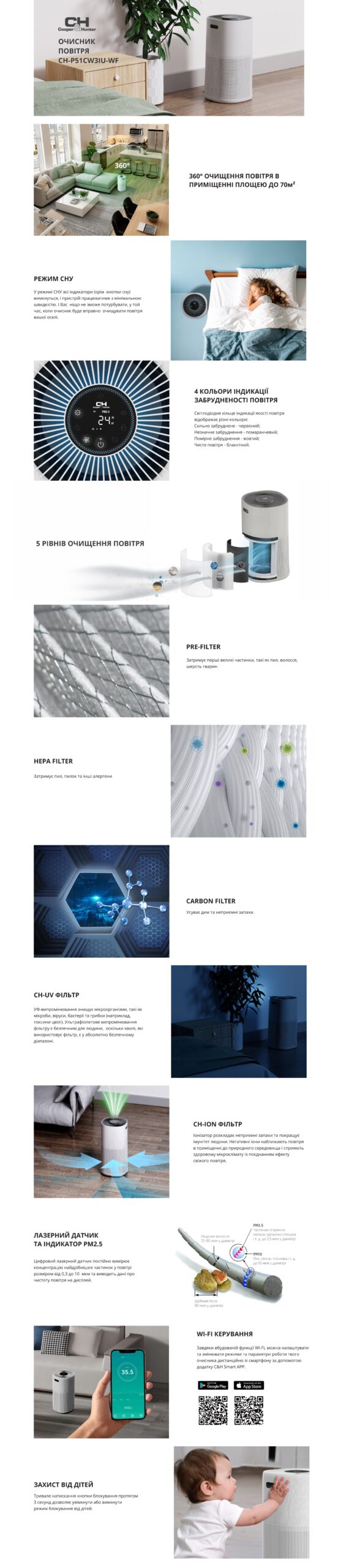 – Іонізатор (CH-Ion filter) генерує негативно заряджені іони (аніони) і освіжає повітря у приміщенні. Аніони зміцнюють нервову і кровоносну системи, покращують діяльність легенів і служать ефективним захистом від респіраторних захворювань (корисні при астмі і пневмонії). Аніони очищують повітря від пилу і диму.